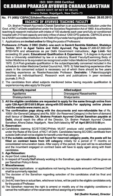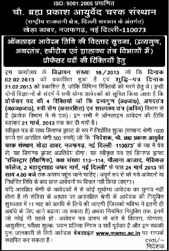 Extension of Last Date for Applying for the post of Professor Ch. Brahm Prakash Ayurved Charak Sansthan,New Delhi