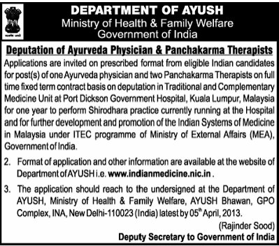 Deputation of one Ayurveda Practitioner and two Therapists for Malaysia. Department of AYUSH,Government of India.