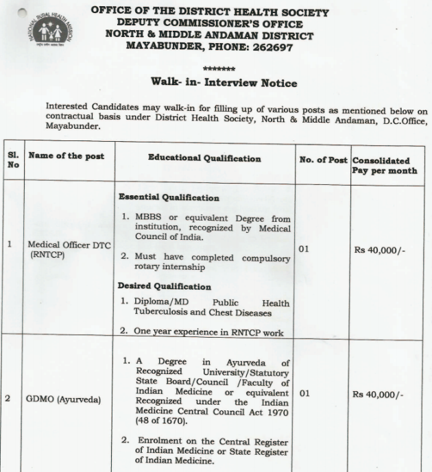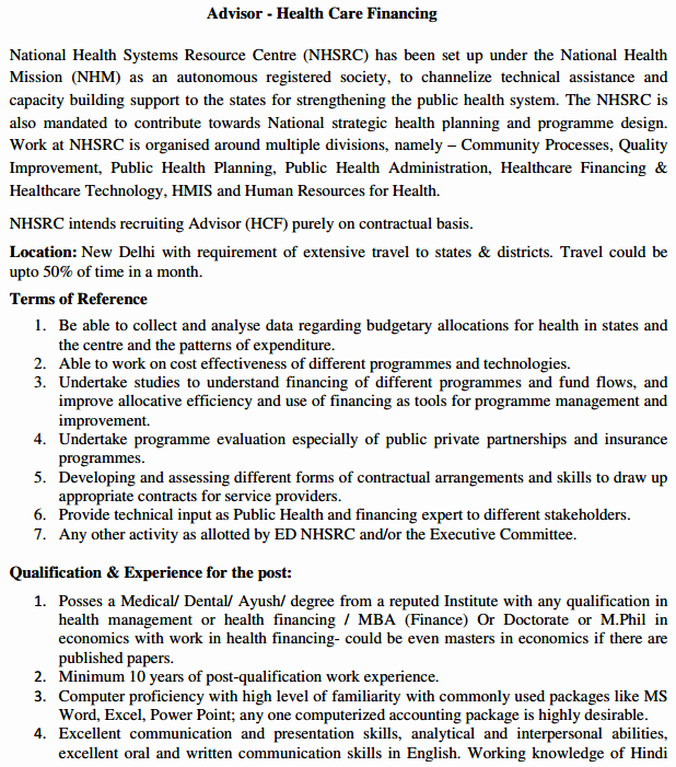 Vacancy for the Post of Advisor-Health Care Financing and Consultant-Quality Improvement, National Health Systems Resource Centre (NHSRC).