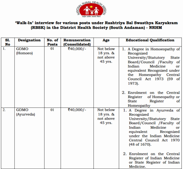 Walk-in-Interview for Posts GDMO(Ayurveda) under Rashtriya Bal Swasthya Karyakram (RBSK) in the District Health Society (South Andaman) - NRHM.