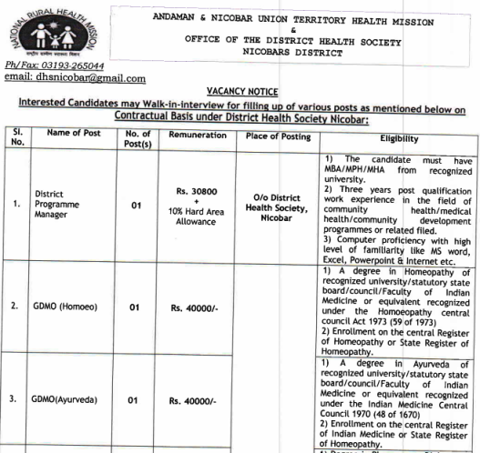 Walk-in-Interview for Posts GDMO(Ayurveda) Andaman and Nicobar Union Territory Health Mission and, Office of the District Health Society,Nicobar District.