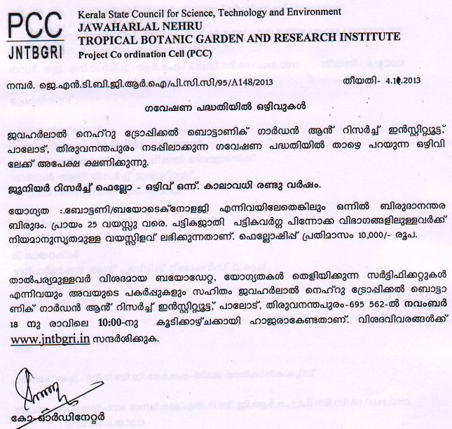 Walk-in-Interview for Posts of Junior Research Fellow(JRF), Jawaharlal Nehru Tropical Botanic Garden and Research Institute,Kerala.