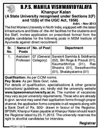 Vacancy for Posts of Assistant Professor, MSM Institute of Ayurveda, BPS Women University,Khanpur Kalan,Sonepat,Haryana.