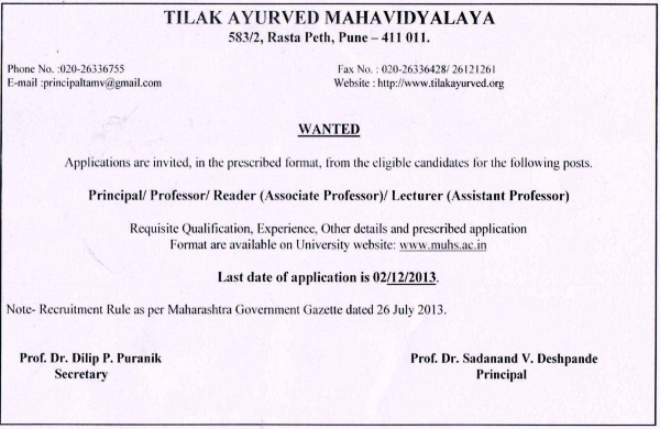 Vacancies for the Posts of Principal,Professor,Reader(Associate Professor) and Lecturer(Assistant Professor), Tilak Ayurved Mahavidyalaya, Pune.