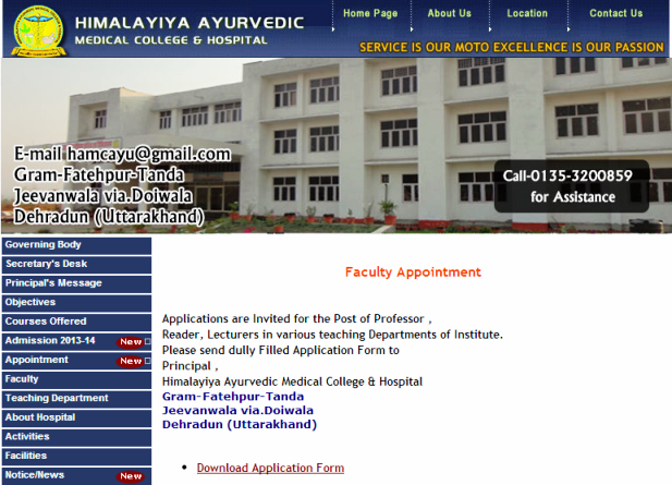 Vacancies for the Posts of Professor,Reader and Lecturers in various teaching Departments of Institute, Himalayiya Ayurvedic Medical College & Hospital,Dehradun ,Uttarakhand.
