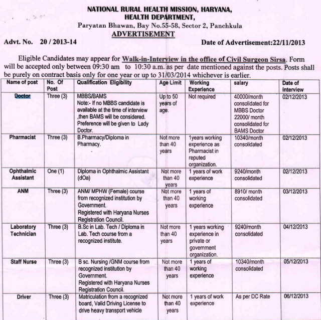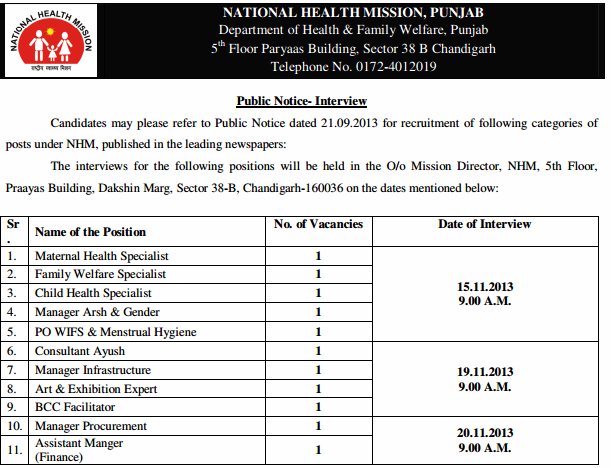 Walk-in-Interview for the Posts of Consultant Ayush National Rural Health Mission(NRHM),Punjab.
