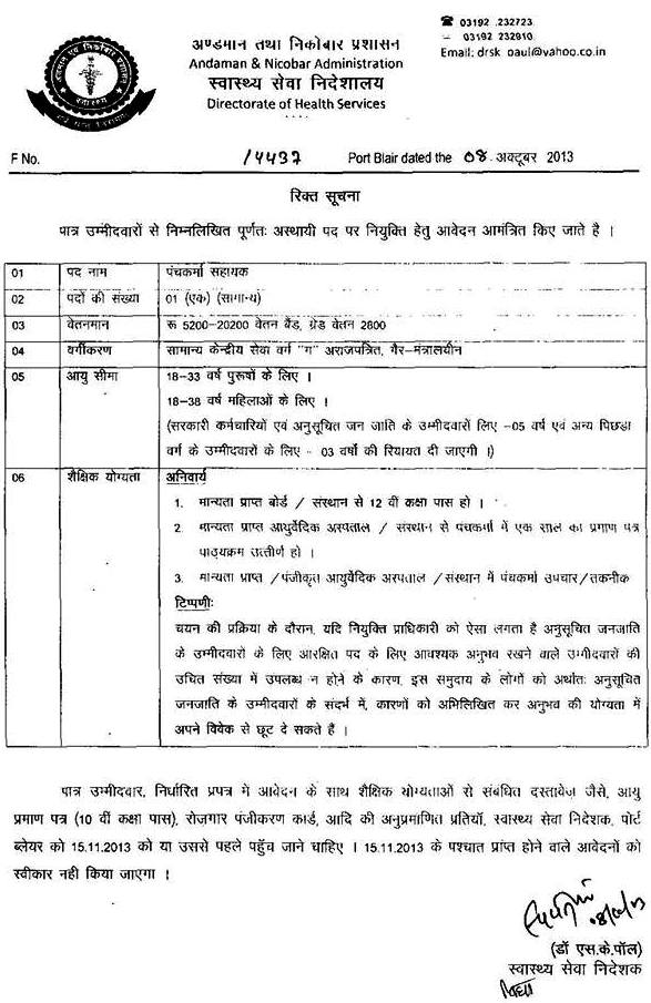Vacancy for the Posts of Panchakarma Assistant Directorate of Health Services,Andaman & Nicobar Administration.