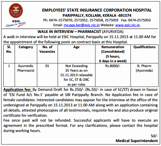 Walk in Interview for the Posts of Ayurvedic Pharmacist, Employees' State Insurance Corporation,Kerala.