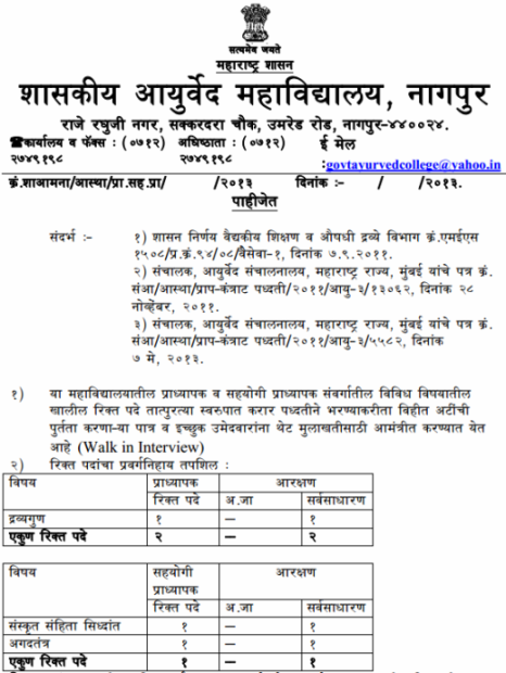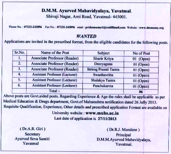 Vacancies for the Posts of Associate Professor(Reader) and Assistant Professor(Lecturer), D.M.M Ayurved Mahavidyalaya,Yavatmal, Maharashtra.