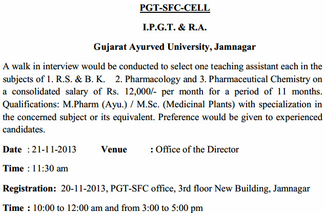 Walk in Interview for the Post of Teaching Assistant each in the subjects of R.S. & B. K.,Pharmacology and Pharmaceutical Chemistry, Gujarat Ayurved University, Jamnagar.