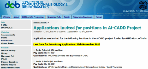 Vacancy for the Posts of Junior Scientist(Ayurveda), Ai-CADD Project,Department of Computational Biology and Bioinformatics, Thiruvananthapuram, Keralam.