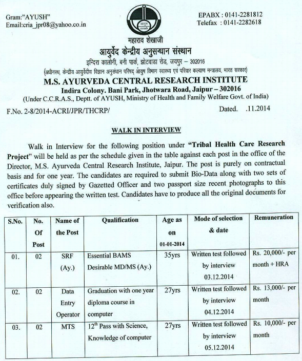 Walk-in interview for the Post of Senior Research Fellow(SRF), M.S.Ayurveda Central Research Institute, Jaipur.