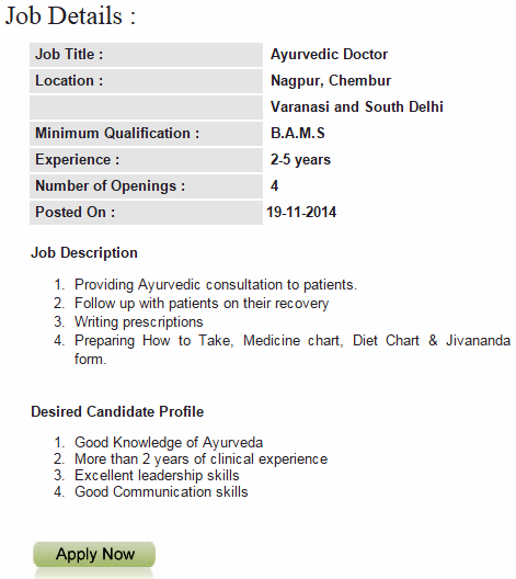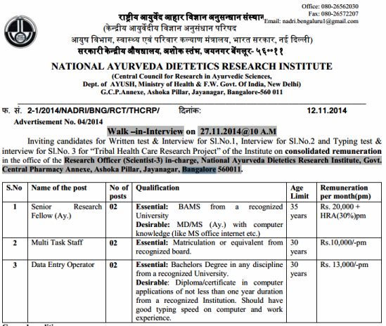 Walk-in interview for the Post of Senior Research Fellow(SRF), National Ayurveda Dietetics Research Institute, Bangalore.
