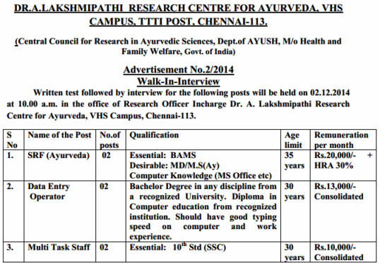 Walk-in interview for the Post of Senior Research Fellow(SRF), Dr. A.Lakshmipathi Research Centre for Ayurveda, VHS Campus, Chennai.