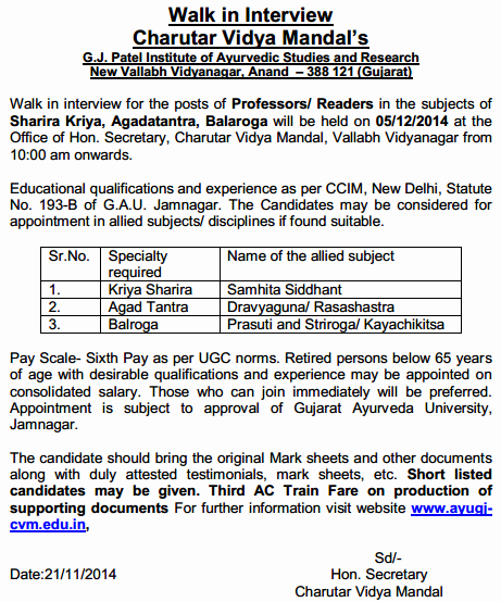 Walk-in interview for the Post of Professors/ Readers, G.J. Patel Institute of Ayurvedic Studies and Research, Anand.
