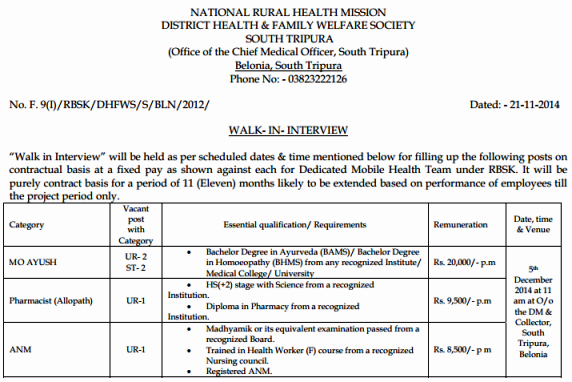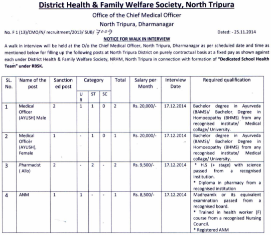 Walk-in interview for the Post of Medical Officer, District Health & Family Welfare Society, North Tripura.