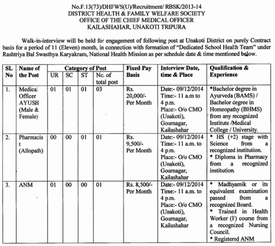 Walk-in interview for the Post of Medical Officer, District Health & Family Welfare Society, Unakoti Tripura.