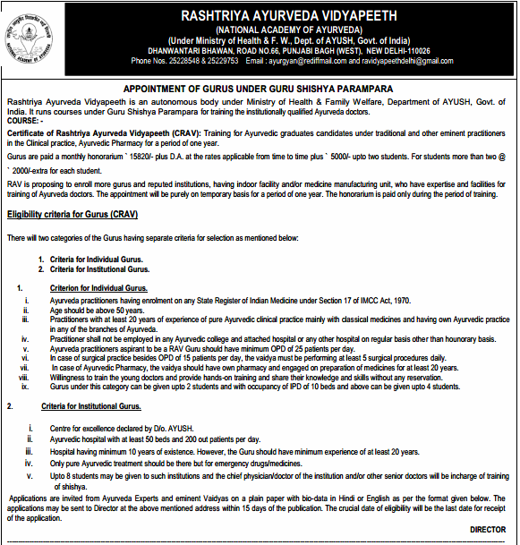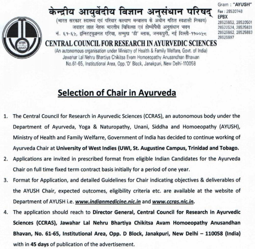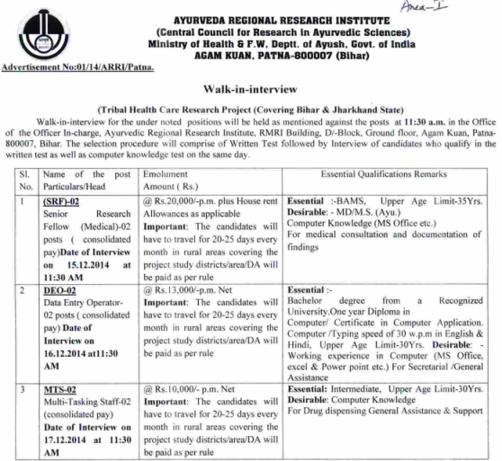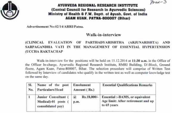 Walk-in interview for the Post of Junior Consultant, Ayurveda Regional Research Institute, Patna.