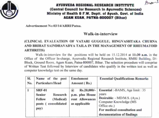 Walk-in interview for the Post of Senior Research Fellow(SRF), Ayurveda Regional Research Institute, Patna.