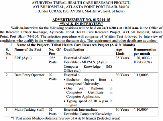Walk-in-interview for the Post of Senior Research Fellow(SRF), Ayurveda Tribal Health Care Research Project, AYUSH Hospital, Atlanta Point, Port Blair.