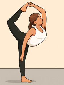 - Inhale again and bend the left leg backwards, reaching your left hand to hold the left foot or thumb.
